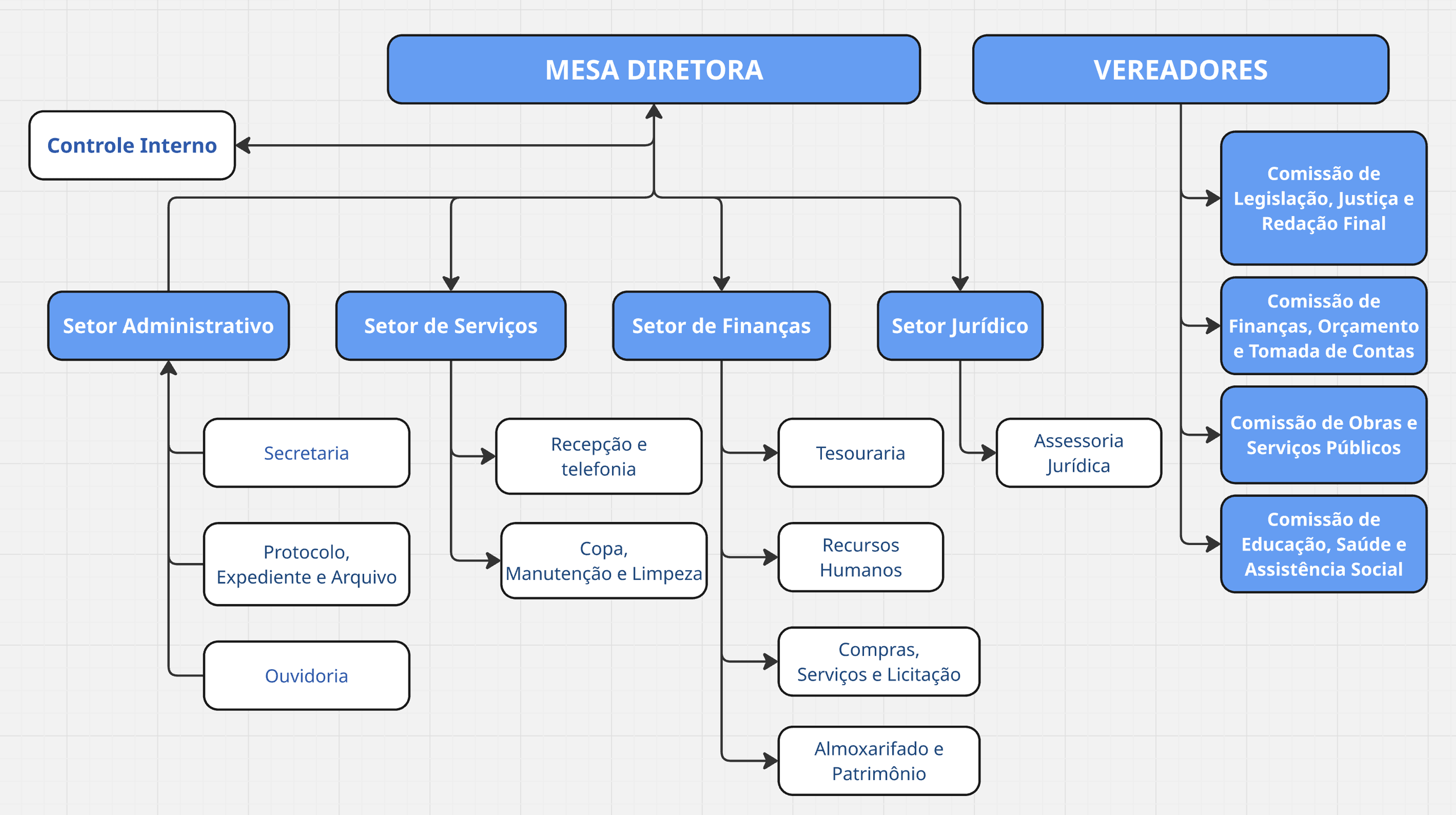 No topo da estrutura organizacional estão o Presidente da Câmara, eleito por seus pares para um mandato de um ano e a Mesa Diretora que é composta pelos Vereadores e pelas Comissões Permanentes.
